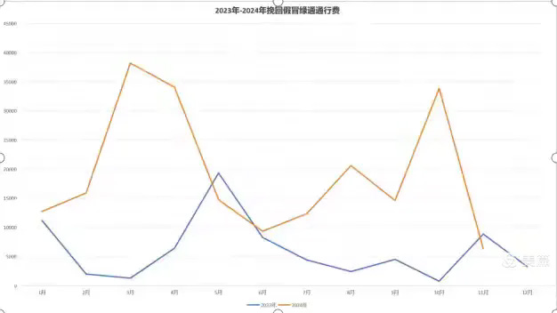 2023 年綠通數(shù)量共 132222 輛,免費(fèi)金額 375834942.22 元。2024年截至 11 月 20 日,綠通數(shù)量共 125346 輛,免費(fèi)金額 333207518.57元。數(shù)據(jù)按月度展開(kāi)如圖: